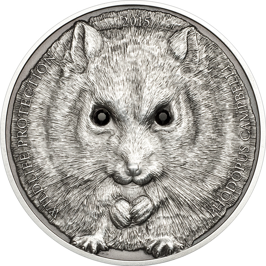 На серебряной монете отмеченной наградами серии «Защита дикой природы» изображен очаровательный хомяк Кэмпбелла. Эта серебряная монета украшена элементами Swarovski и имеет красивую античную отделку. Тираж всего 2500 монет. Поставляется в оригинальной капсуле и деревянной коробке.
