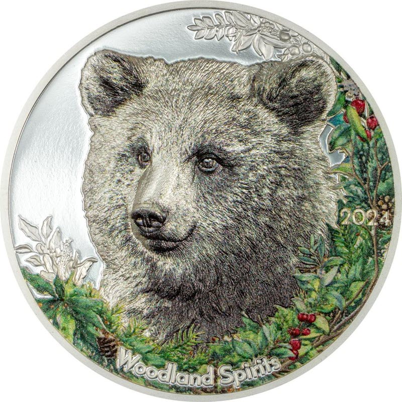На реверсе изображен медведь в окружении растений. Справа: 2024 (год чеканки), внизу: Woodland Spirits (серия).