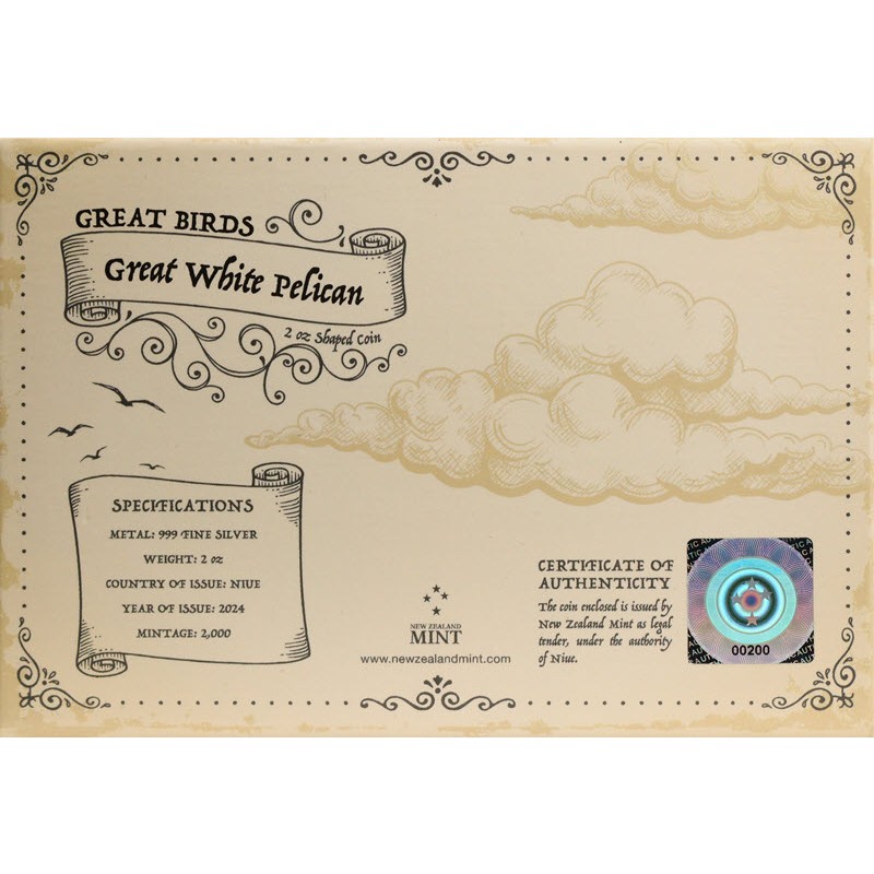 Эта замечательная серебряная монета весом 2 унции посвящена большому белому пеликану - крупному виду пеликанов, обитающему в Африке, Европе и Азии. Монета имеет форму и качество Proof. Монета поставляется в футляре вместе с сертификатом подлинности. Ограниченный тираж - всего 2.000 штук по всему миру.