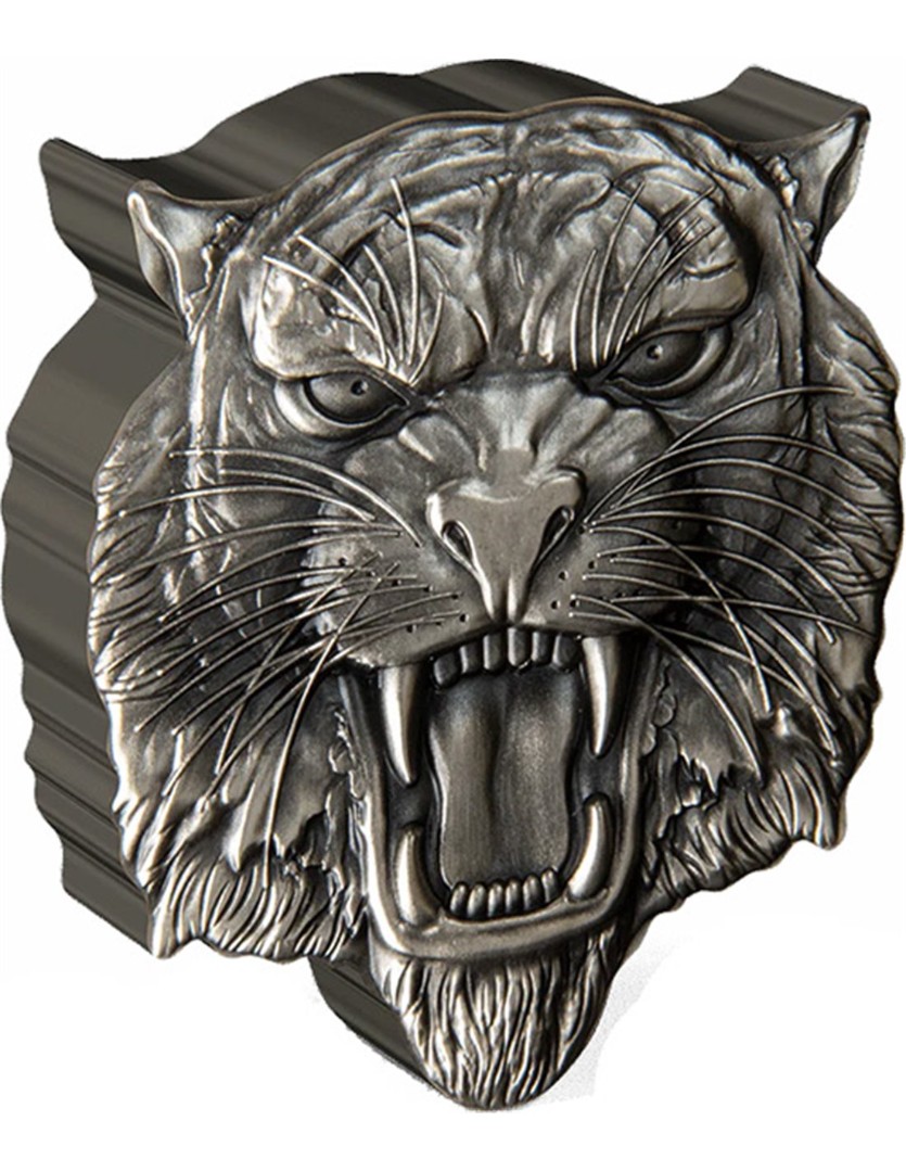 Монета, выполненная в форме головы тигра с широко раскрытой пастью. Античная отделка и реалистичность гравировки делают данную монету особо впечатляющей. Монета находится в акриловой капсуле, отлитой по ее форме и упакована в тематический футляр. Сертификат подлинности прилагается. Ограниченный тираж — 2000 штук.