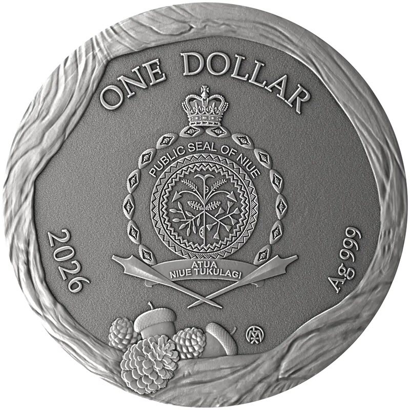 На аверсе монеты изображена неофициальная «Государственная печать Ниуэ». Это  композиция из растений в центре внутри двойного декоративного круга, окруженного морскими раковинами. Он увенчан короной Святого Эдуарда (символом Соединенного Королевства, монарх которого в конечном итоге является главой государства Ниуэ). Сверху между ними надпись PUBLIC SEAL OF NIUE. Ниже на ленте в две строки изображен девиз ATUA NIUE TUKULAGI, ниже которых две перекрещенные катуа. Вдоль канта надпись: ONE DOLLAR 2026 LM Ag 999 (номинал, год чеканки, монограмма литовского монетного двора, проба серебра).