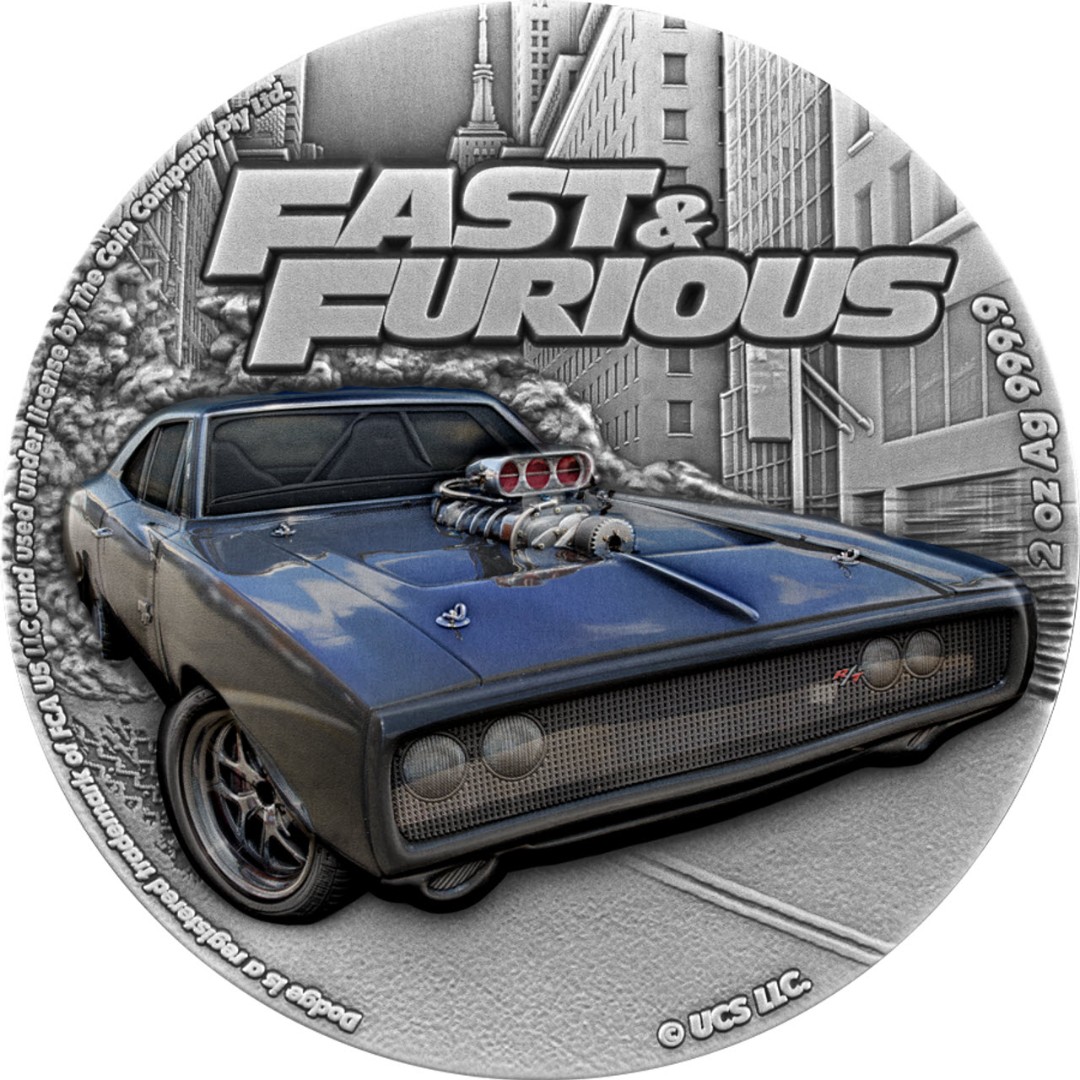 На реверсе изображен Dodge Charger R/T 1970 года. Над ним надпись в две строки: FAST & FURIOUS TM (Форсаж). Вдоль канта надпись: Dodge is a registered of FCA US LLC and used under license by the Coin Company Pty Ltd. © UCS LLC. 2 oz Ag 999.9 (лицензия, вес и проба серебра).