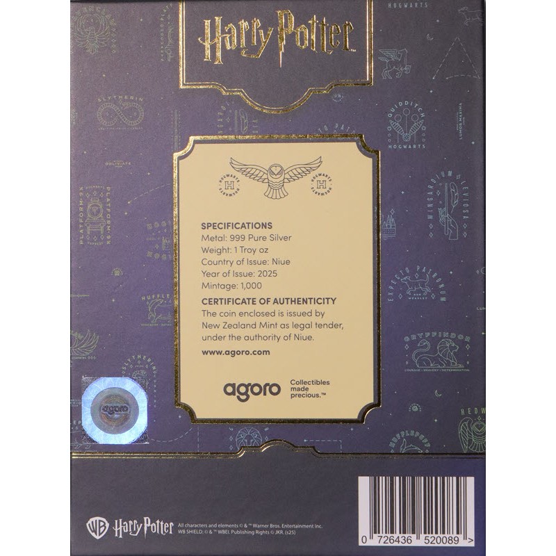 На аверсе на лицевой стороне паровоза надпись: HOGWARTS EXPRESS 5972 Two Dollars · 1 oz 999 Pure Silver 2025 хххх/1000 (Хогвартс-экспресс и его номер, номинал, вес и проба серебра, год чеканки, индивидуальный номер монеты). На боку надпись: © & ™ WBEI. (s25) (авторские права). На тендере изображен герб Ниуэ.