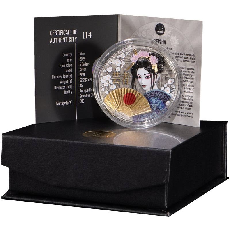 Эта удивительная серебряная монета весом в 2 унции от литовского монетного двора T&S Coin посвящена гейше. У нее качество античной отделки, высокий рельеф, выборочное золочение и селективная окраска. Поставляется в оригинальном футляре с сертификатом подлинности. Тираж: 500 штук.