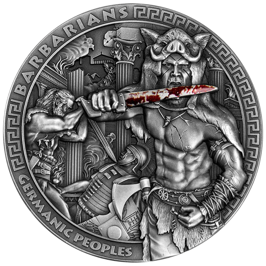 На реверсе монеты изображены германские племена, олицетворяющие власть и преемственность, их военная мощь и миграции способствовали ключевым изменениям в политической структуре Европы. Эта уникальная монета является символом силы и постоянства.
