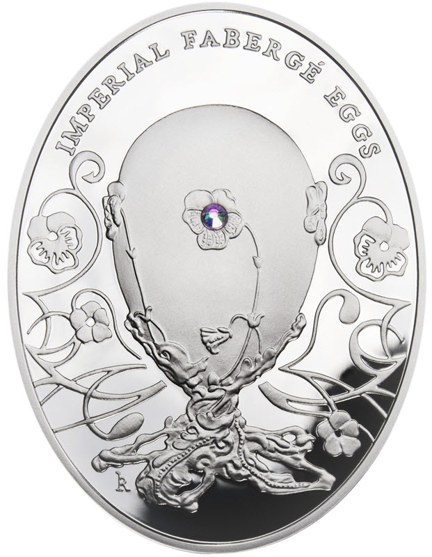 На реверсе в центре стилизованное изображение яйца «Анютины глазки» с фианитом фиолетового цвета на фоне растительного орнамента. Вверху надпись: IMPERIAL FABERGE EGGS (Императорские яйца Фаберже).