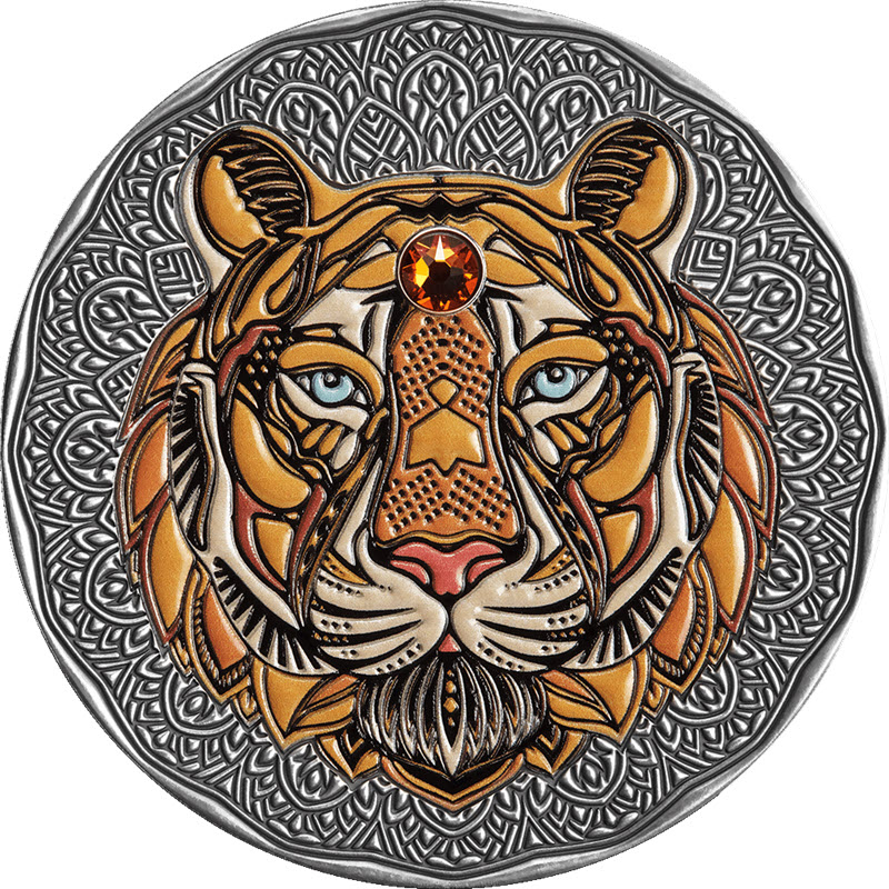 Эта серебряная монета весом в 2 унции 999 пробы – 4-я из серии "Mandala Art" и изображает чудесного тигра. У нее невероятный дизайн, античная отделка, селективная окраска и вставки из кристаллов Swarovski®. Поставляется в футляре с сертификатом подлинности. Тираж: 500 штук.