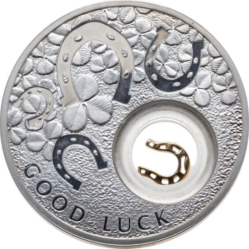 На реверсе изображены четыре подковы и листья клевера, а также надпись «GOOD LUCK» (Удачи). Справа внизу - прозрачная капсула с подвижной миниатюрной серебряной подковой, позолоченная 24-каратным золотом.