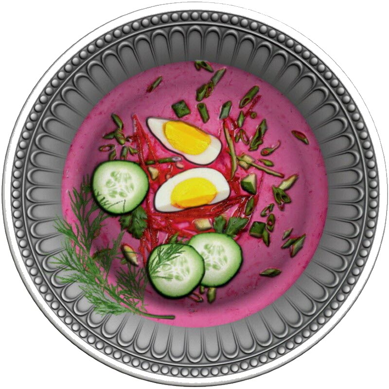 Эта поразительная серебряная монета весом в 1 унцию является новым выпуском серии «Вкус мира», посвященной Šaltibarščiai - розовому холодному супу. .Ограниченный тираж всего 1000 штук по всему миру!