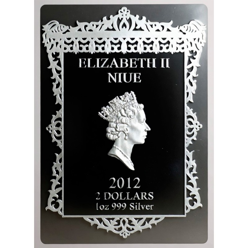 В центре в декоративной рамке, стилизованной под резные русские наличники - портрет Ее Величества Королевы Елизаветы II дизайнера Рафаэля Маклауфа (Raphael David Maklouf). Вверху надпись в две строки: ELIZABETH II NIUE (Елизавета II, страна-эмитент). Внизу надпись в три строки: 2012  2 DOLLARS 1 oz 999 Silver (год чеканки, номинал, вес и проба серебра).