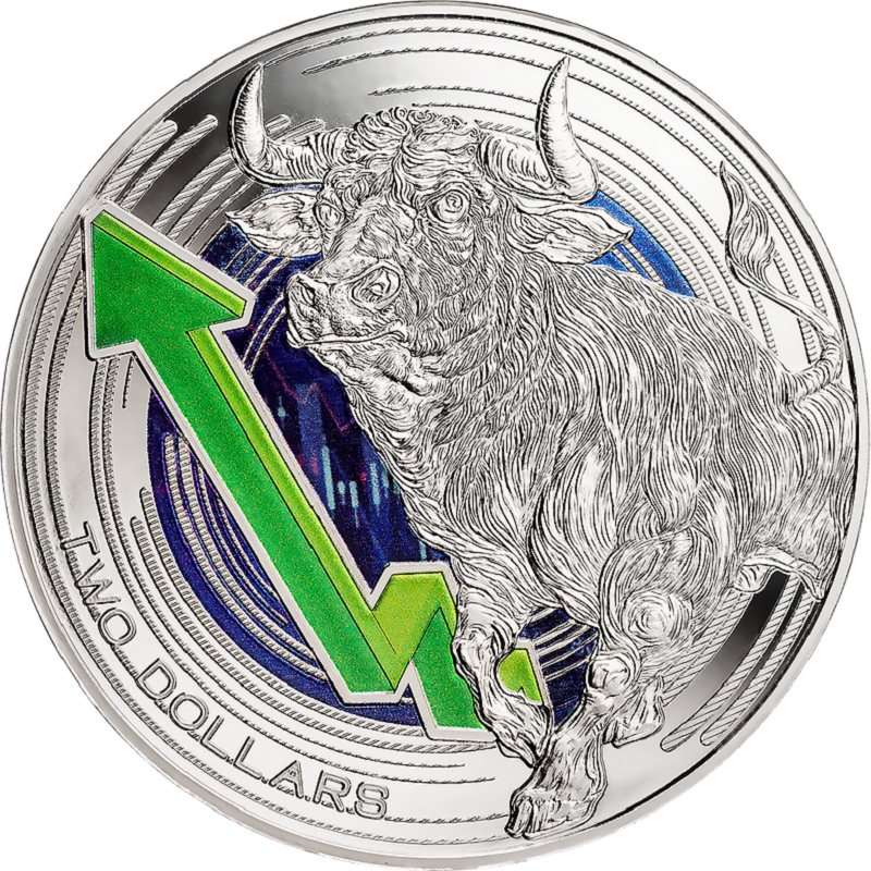 На реверсе монеты изображены бык и зеленая стрела, символизирующие финансовый бычий рынок, который соответствует сильному экономическому росту и здоровым корпоративным доходам. На реверсе надпись "TWO DOLLARS" - номинал.