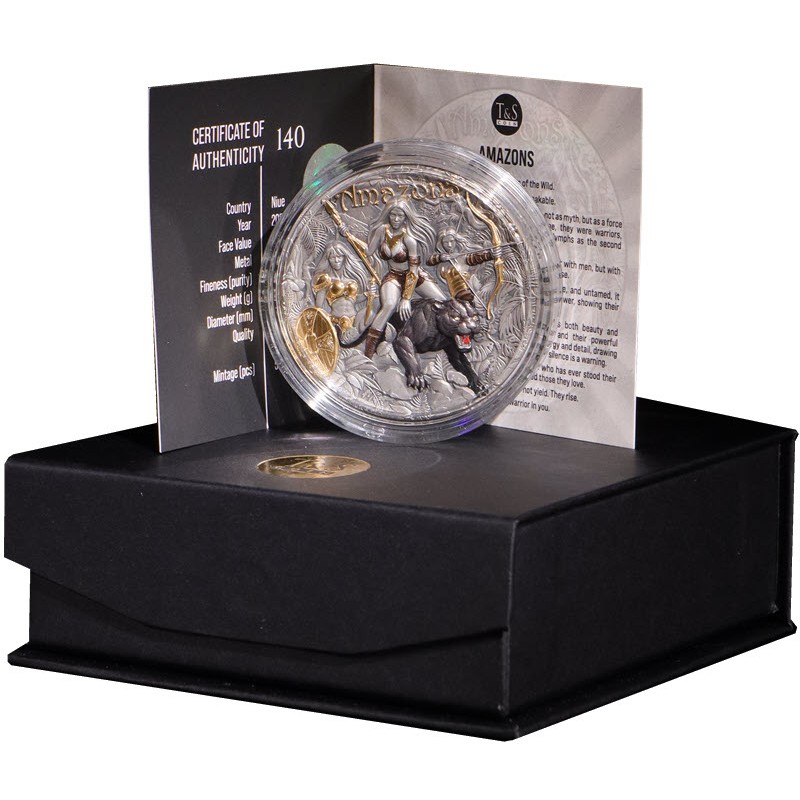 Эта удивительная серебряная монета весом в 2 унции от литовского монетного двора T&S Coin посвящена амазонкам - вторая из серии «Вечные сестры». У нее качество античной отделки, высокий рельеф, выборочное золочение и селективная окраска. Поставляется в оригинальном футляре с сертификатом подлинности. Тираж: 500 штук.
