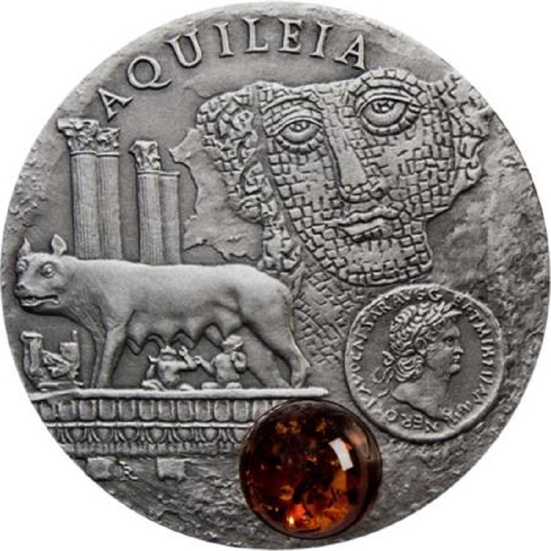 Вверху полукруглая надпись – AQUILEIA. Внизу слева – колонны из Foro Romano di Aquileia и изображение мифической волчицы, вскармливающей Рема и Ромула (символ Римской империи), стоящих перед базиликой Аквилеи. Справа – римская античная мозаика с изображением женской головы. Под ним изображение римской монеты, найденной в окрестностях Аквилеи. Внизу янтарная вставка.