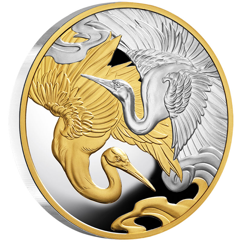 На реверсе изображены танцующие журавли в серебряном и золотом одеянии.