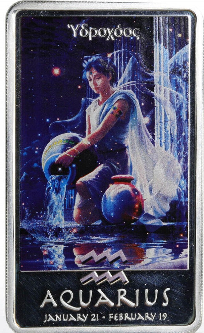 В центре - цветное изображение фрагмента одной из двенадцати картин серии «Зодиак» известного современного японского художника Ютаки Кагаи, работающего в компьютерной технике в стиле фэнтези. Раскрашенное изображение мальчика, льющего воду, дополнено графическим символом знака зодиака и надписями с его названием на греческом вверху и латинском внизу языках и соответствующими знаку датами.