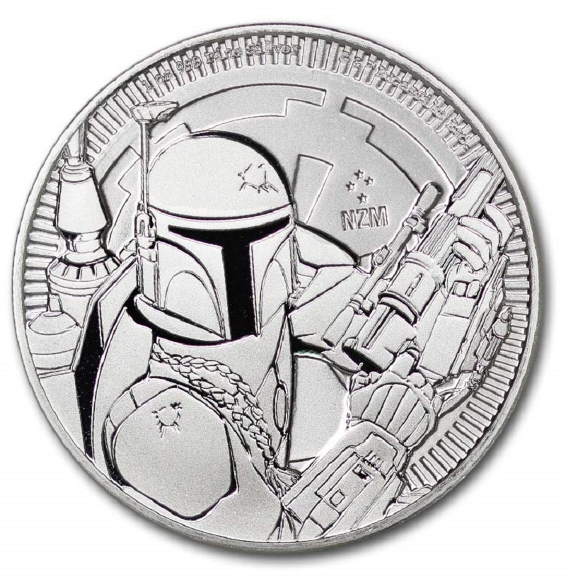 Изображение Фетта, одетого в полную мандалорскую броню и вооруженного винтовкой. Фоновые поля включают изображение представителя Галактической Империи и знак монетного двора Новой Зеландии. Знак Монетного двора Новой Зеландии — созвездие Южного Креста.
