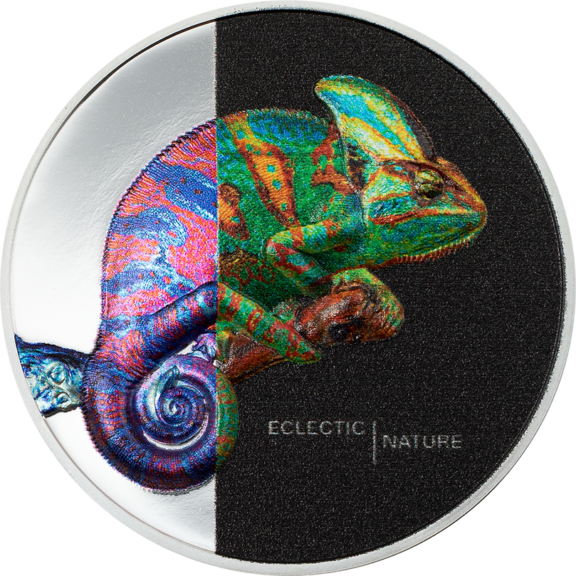 На этой специальной серебряной монете весом в 1 унцию из серии "Eclectic Nature" изображен Хамелеон. Монета создана в сочетании разных стилей, имеет качество Proof и сверхвысокий рельеф благодаря технологии Smartminting. Поставляется в футляре вместе с сертификатом подлинности. Ограниченный тираж 1500 штук.