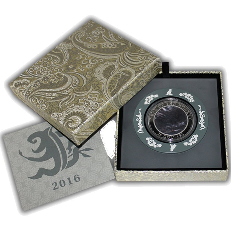 Эта красивая серебряная монета весом в 5 унций входит в серию «Лунный календарь» и посвящена тем, кто родился в китайский год Обезьяны. У нее перламутровая вставка и качество пруф. Поставляется в элегантном футляре с сертификатом подлинности. Тираж: 888 штук.