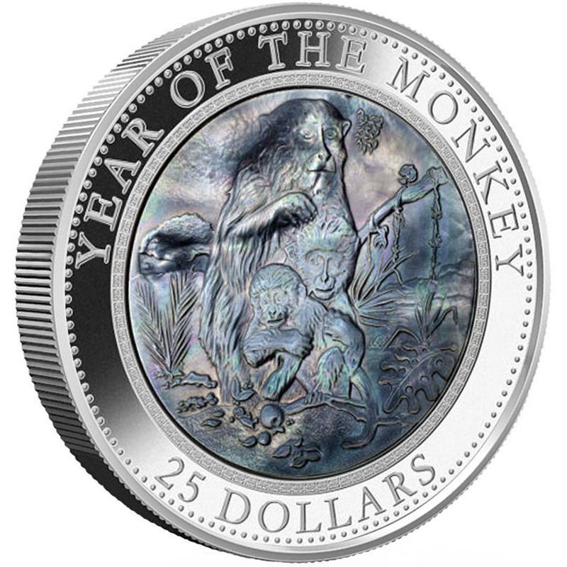 На реверсе изображена семья обезьян, инкрустированная серым перламутром. Вверху вдоль канта надпись: YEAR OF THE MONKEY (Год Обезьяны). Внизу: 25 DOLLARS (номинал).