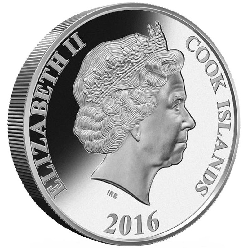 На аверсе изображена Ее Величество королева Елизавета II в бриллиантовой тиаре. Под портретом королевы инициалы дизайнера IRB (Ian Rank Broadley). Вдоль канта надпись: ELIZABETH II COOK ISLANDS 2016 (Елизавета II, страна-эмитент, год чеканки).
