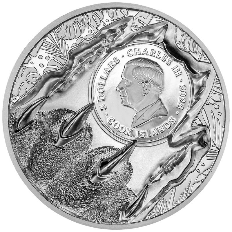 На аверсе изображены когти тигра, удерживая монету с портретом короля Чарльза III. Внизу портрета инициалы дизайнера TD (Dan Thorne). Вокруг портрета надпись: 5 DOLLARS · CHARLES III · 2025 · COOK ISLANDS · (номинал, Чарльз III, год чеканки, страна-эмитент). Фоном служат растительные орнаменты.
