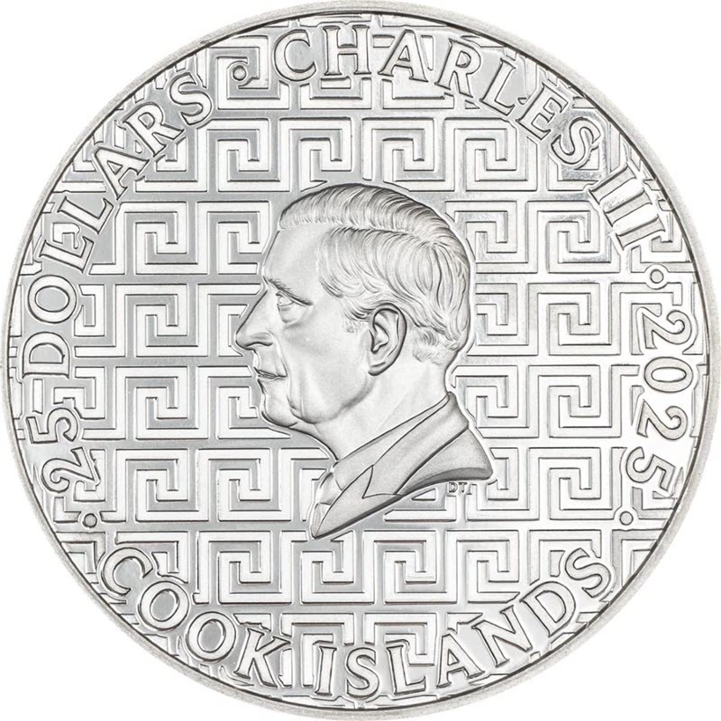 На аверсе изображен Его Величество король Чарльз III. Внизу портрета инициалы дизайнера TD (Dan Thorne). Вдоль канта надпись: 25 DOLLARS · CHARLES III · 2025 · COOK ISLANDS · (номинал, Чарльз III, год чеканки, страна-эмитент).