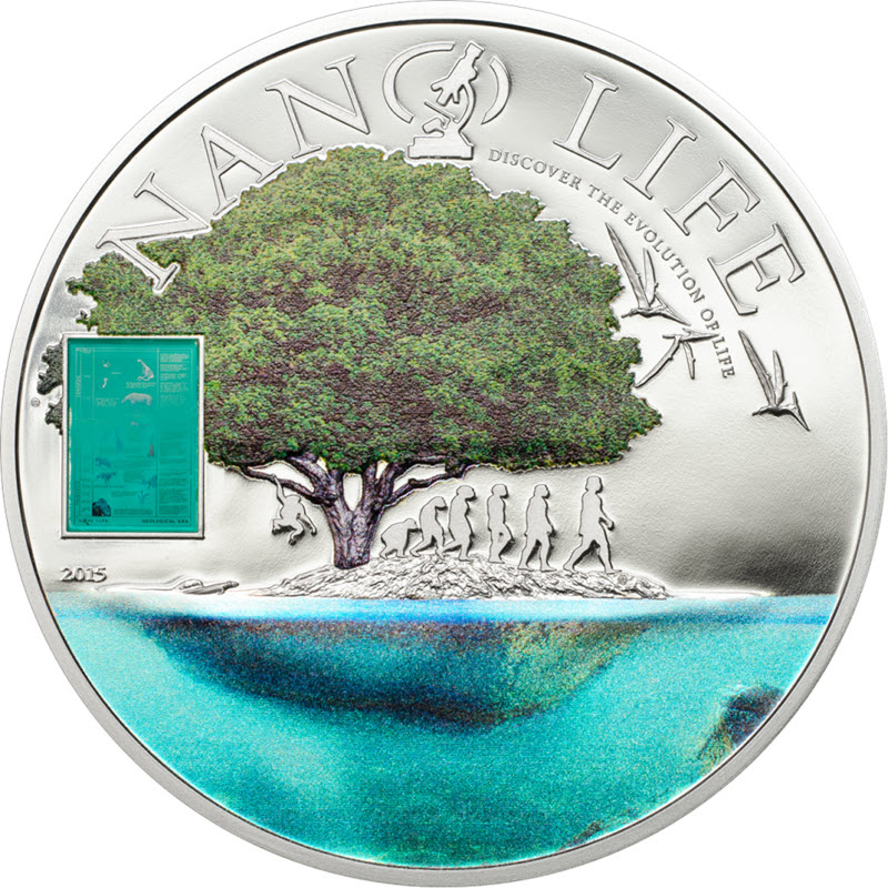 Реверс монеты напоминает о концепции эволюции. Надпись NANO LIFE. Год выпуска — 2015.