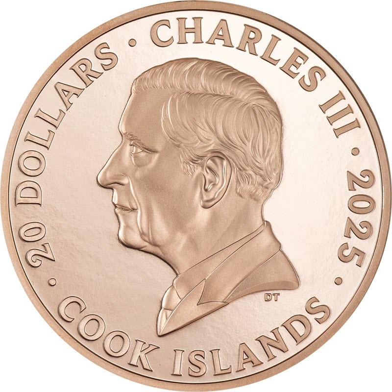 На аверсе изображен Его Величество король Чарльз III. Внизу портрета инициалы дизайнера TD (Dan Thorne). Вдоль канта надпись: 20 DOLLARS · CHARLES III · 2025 · COOK ISLANDS · (номинал, Чарльз III, год чеканки, страна-эмитент).