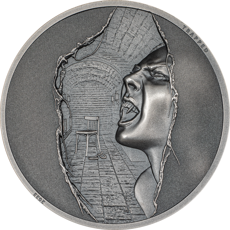 На реверсе монеты на переднем плане изображена сильно разорванная ткань, создающая трещину, за которой можно увидеть угрожающее выражение лица вампира. Эта монета на самом деле принадлежит к серии, повествующей об условиях заточения и страданиях, из которых сбегают. Сверху на канте надпись TRAPPED; слева внизу год чеканки 2023.