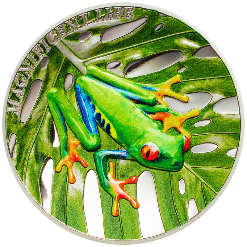 Эта красивая серебряная монета весом в 1 унцию - четвертая из серии «Великолепная жизнь» - посвящена древесной лягушке. У нее технология smartminting©, селективная окраска и качество пруф. Поставляется в футляре с сертификатом подлинности. Тираж: 999 штук.