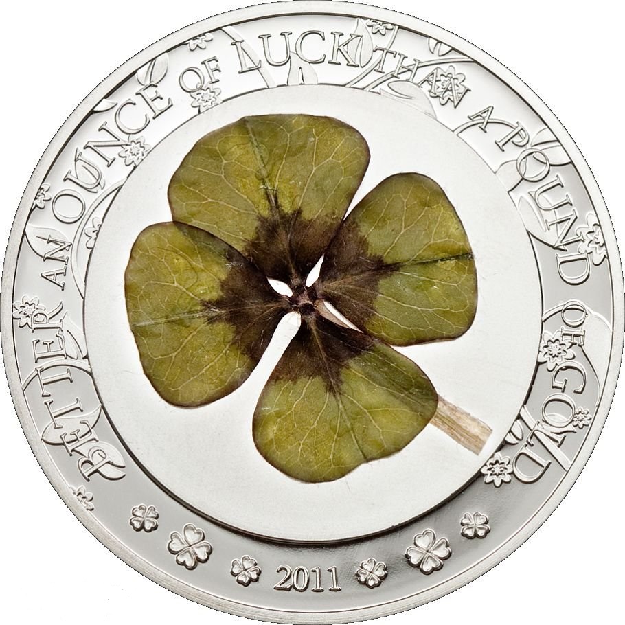 Серебряная монета-талисман с символом удачи - четырехлистным клевером.
