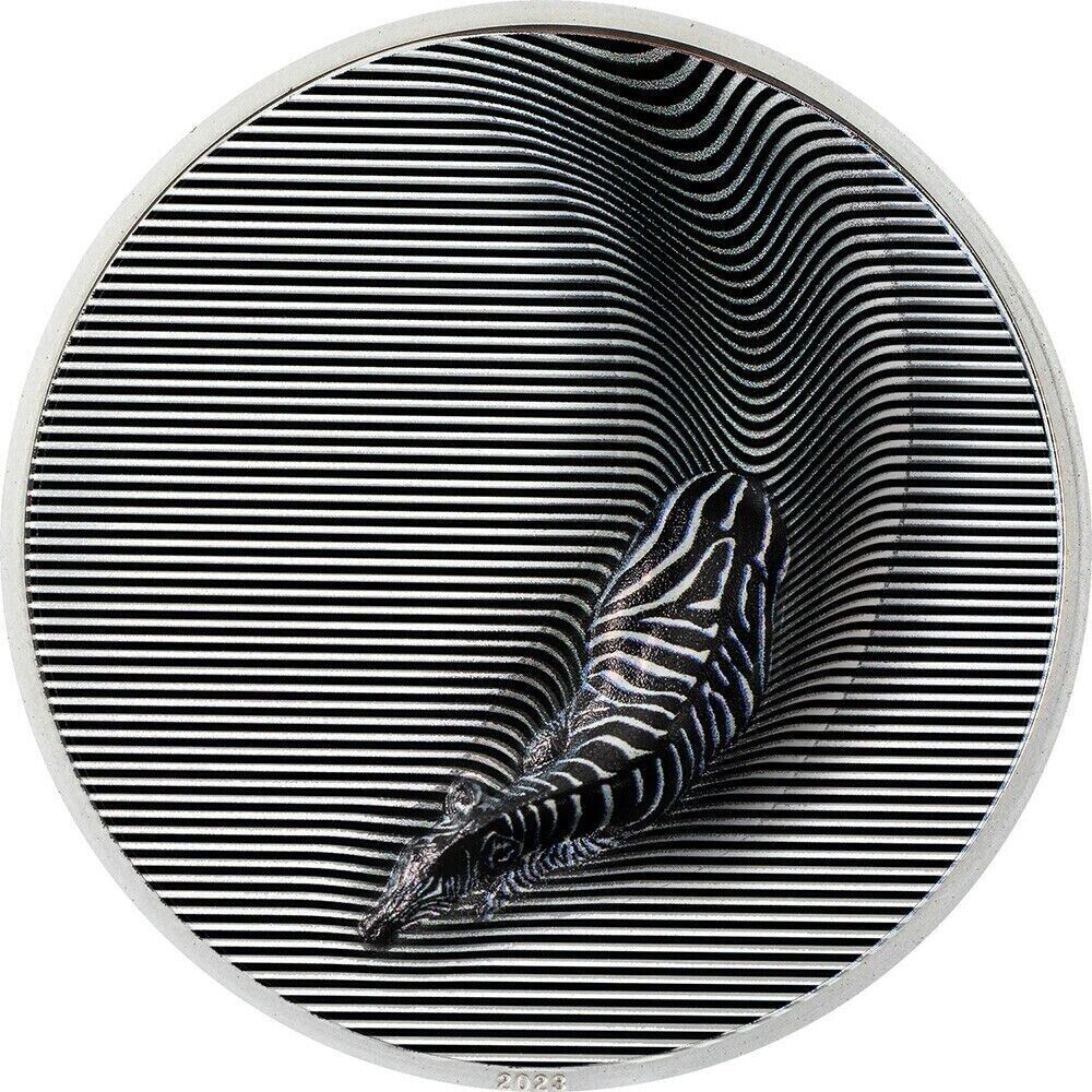 На реверсе монеты изображен гипнотизирующий узор с черными и серебряными горизонтальными линиями, создающими трехмерный эффект и оптическую иллюзию движения. Узор прерывается красивой зеброй, которая видна сверху и делает вогнутый след, проходя по линиям. Оптическая иллюзия также показывает некоторые цвета при взгляде на узор, хотя монета не окрашена! В нижней части реверса надпись: "2023" - год выпуска.