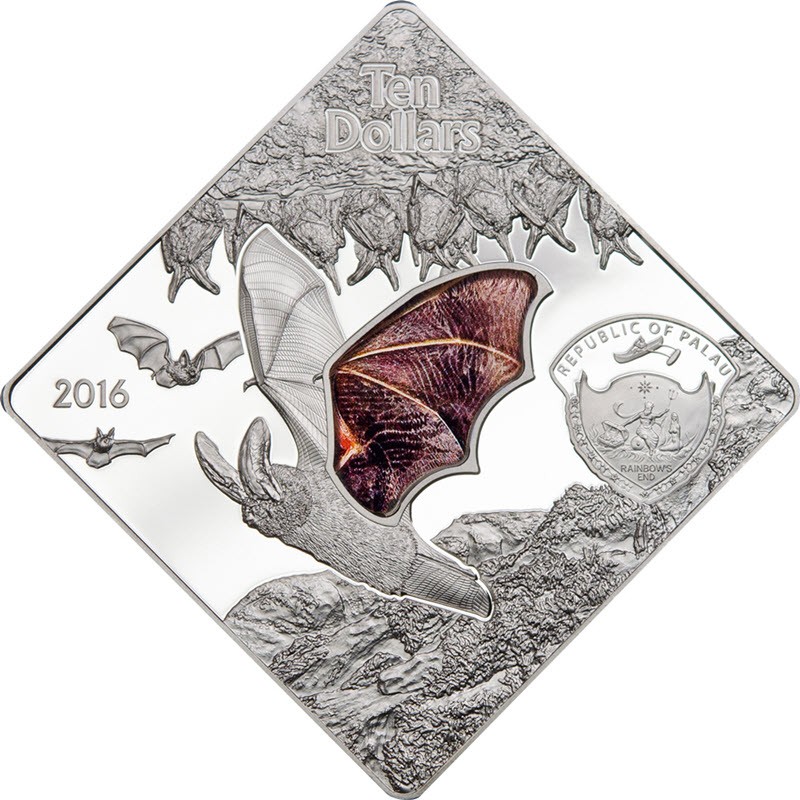 На аверсе изображена летучая мышь в полёте на фоне пещеры. Справа неофициальный «Герб Палау». В центре изображен морской бог Нептун, увенчанный короной, сидящий на круглом камне и держащий в левой руке трезубец; справа русалка; слева сундук с сокровищами. Над Нептуном звезда. Под волнами надпись RAINBOW'S END. Над щитом туземный гребец на байдарке. Вверху надпись: TEN DOLLARS (номинал), слева: 2016 (год чеканки).