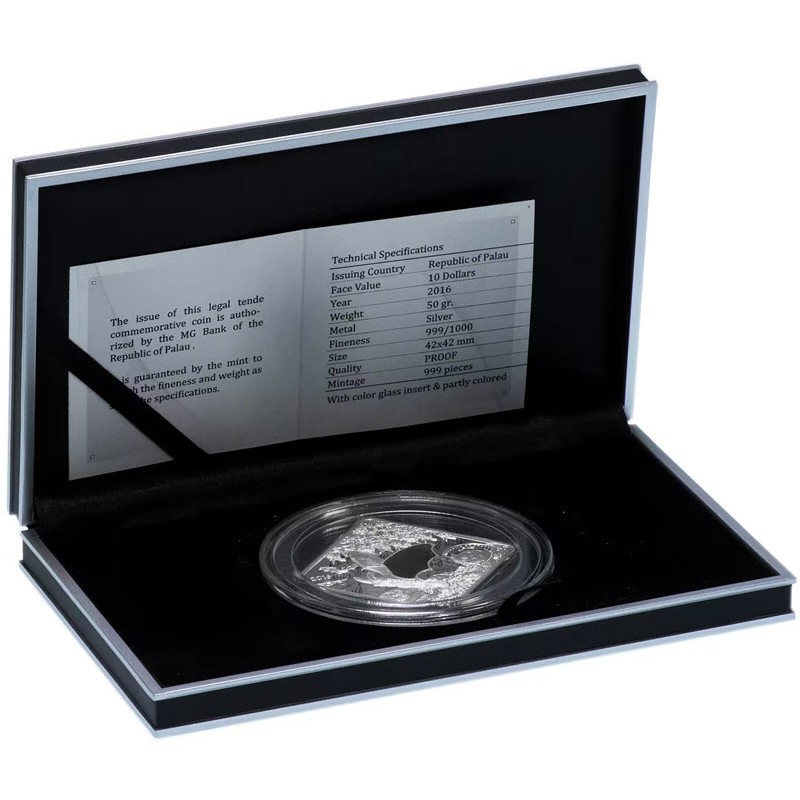 Эта чудесная серебряная монета - вторая из серии «Животные в стекле» - посвящена летучей мыши. У нее размеры 42 х 42 мм, качество пруф, селективная окраска и цветная стеклянная вставка. Поставляется в оригинальном футляре с сертификатом подлинности. Тираж: 999 штук.