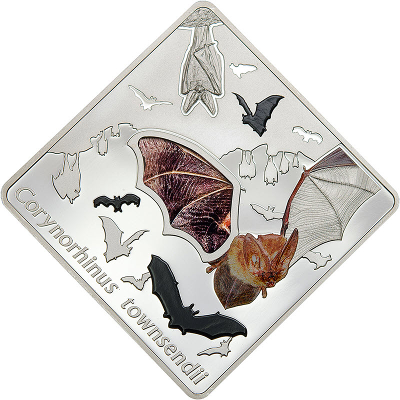 На реверсе изображена летучая мышь в полёте, в окружении стилизованных летучих мышей, подчеркнутых лишь небольшим количеством цвета. Слева внизу надпись: Corynorhinus townsendii.
