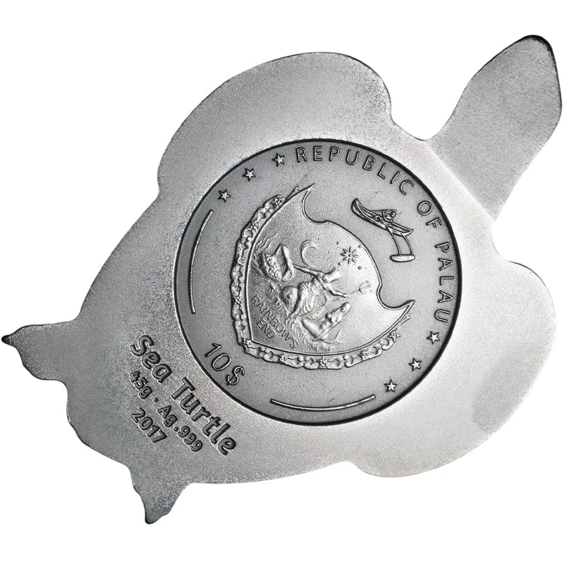 В нижней части монеты надписи в три строки: SEA TURTLE 45g · Ag.999 2017 (Морская черепаха, вес и проба серебра, год чеканки)