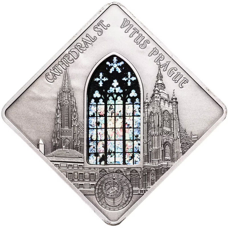 На реверсе изображен внешний вид собора Святого Вита с витражом работы Альфонса Мухи. Вверху надпись: CATHEDRAL SAINT VITUS PRAGUE.