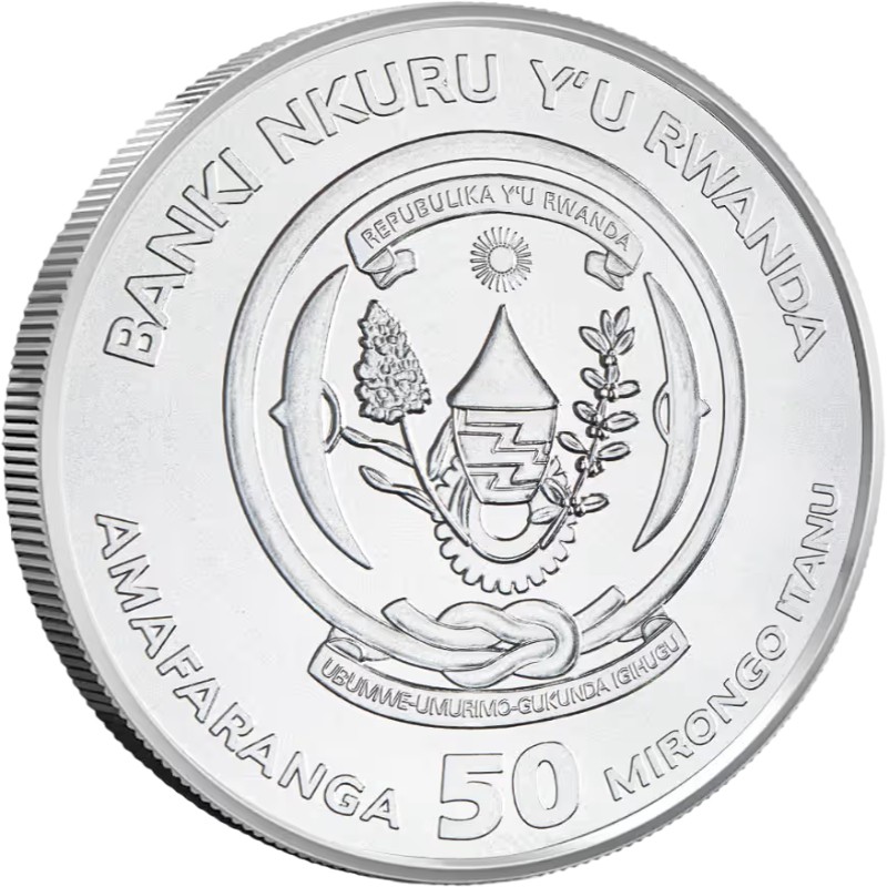 Вверху вдоль канта: BANKI NKURU Y'U RWANDA (Национальный банк Руанды), внизу: AMAFARANGA 50 MIRONGO ITANU (номинал).