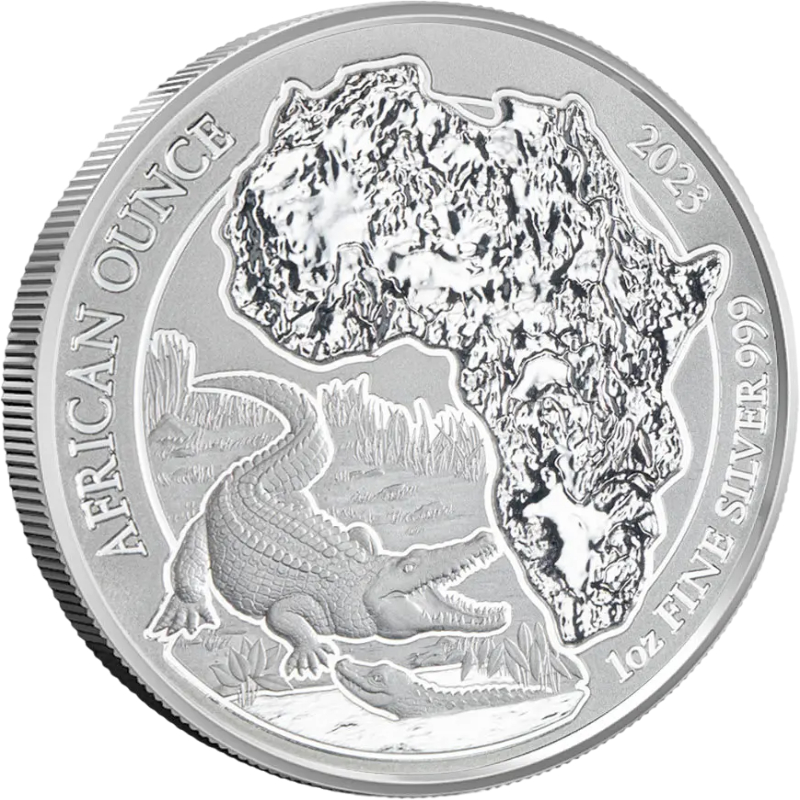 Внизу слева - изображение двух нильских крокодилов в естественной среде обитания у реки. Над ним расположен топографический контур Африканского континента. Вдоль канта по кругу надписи: AFRICAN OUNCE 2023 1oz FINE SILVER 999 (Африканская унция, год чеканки, вес и проба серебра).