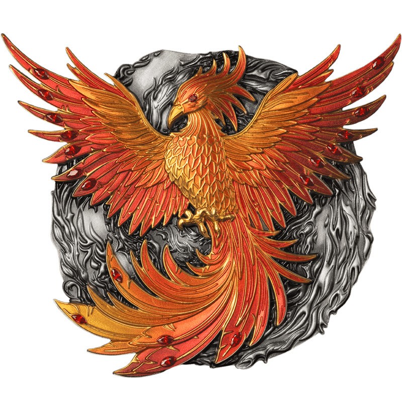 Эта серебряная монета замечательной формы размером 120 Х 110 мм и весом 500 грамм посвящена Фениксу. У нее античная отделка, потрясающий рельеф, выборочное золочение, цветной принт и красные кристаллы. Поставляется в элегантном футляре с сертификатом подлинности. Тираж: 399 штук.