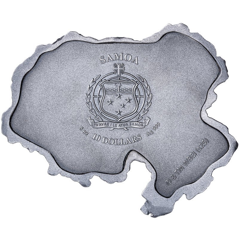 На аверсе изображен герб Самоа. Вокруг герба надпись: SAMOA 5 oz 10 DOLLARS Ag999 (страна-эмитент, вес и проба серебра, номинал). Справа внизу: © & TM WBEI (s25) (авторские права).