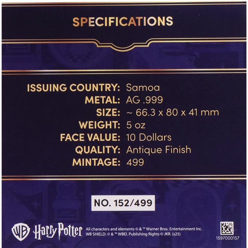 Эта чудесная серебряная монета посвящена готическому замку Хогвартс. У неё размеры 41 Х 66.3 Х 80 мм и качество античной отделки. Поставляется в акриловом футляре с сертификатом подлинности. Тираж: 499 штук.
