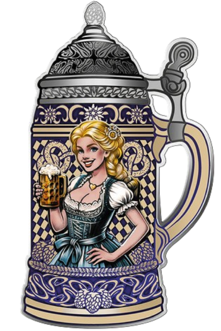 Эта великолепная серебряная монета прославляет немецкую пивную культуру и изображает традиционную пивную кружку с классическим баварским узором и мотивами в прекрасной цветной печати. Монета поставляется в блистерной упаковке в стиле пивоваренного завода вместе с сертификатом подлинности. Ограниченный тираж 1,999 штук по всему миру.
