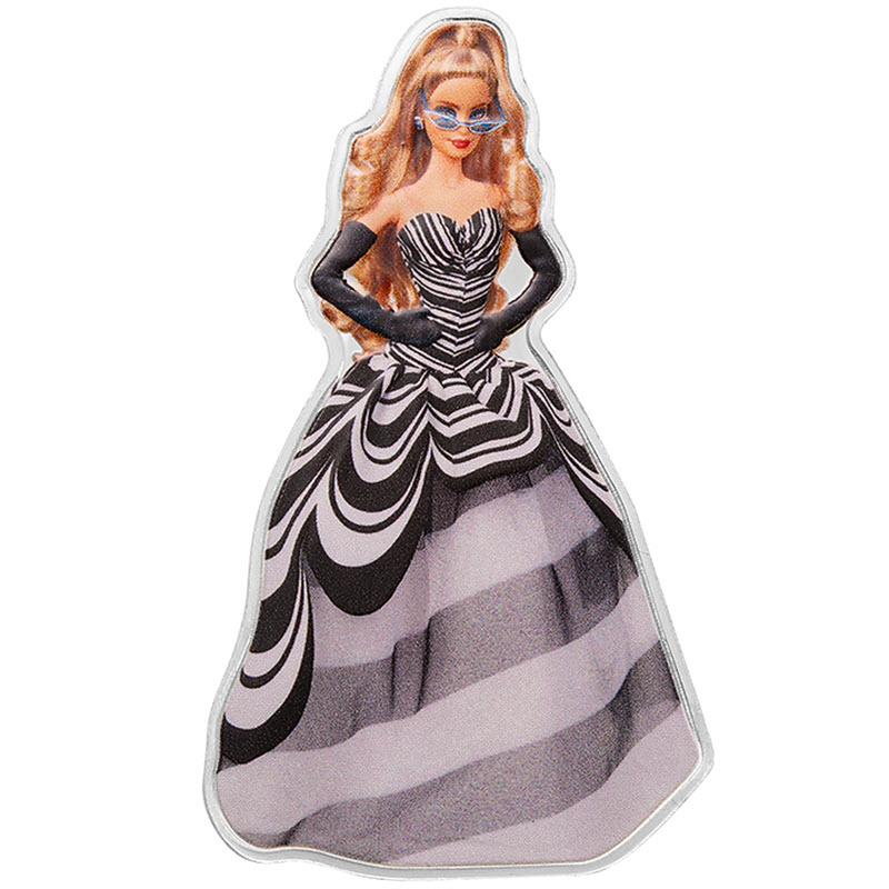 Эта чудесная серебряная монета посвящена 65-летию куклы Барби (сапфировый юбилей). У нее размер 34.6 Х 60 мм, сапфировые серьги и качество пруф-лайк. Поставляется в оригинальном футляре с сертификатом подлинности. Тираж: 3000 штук.