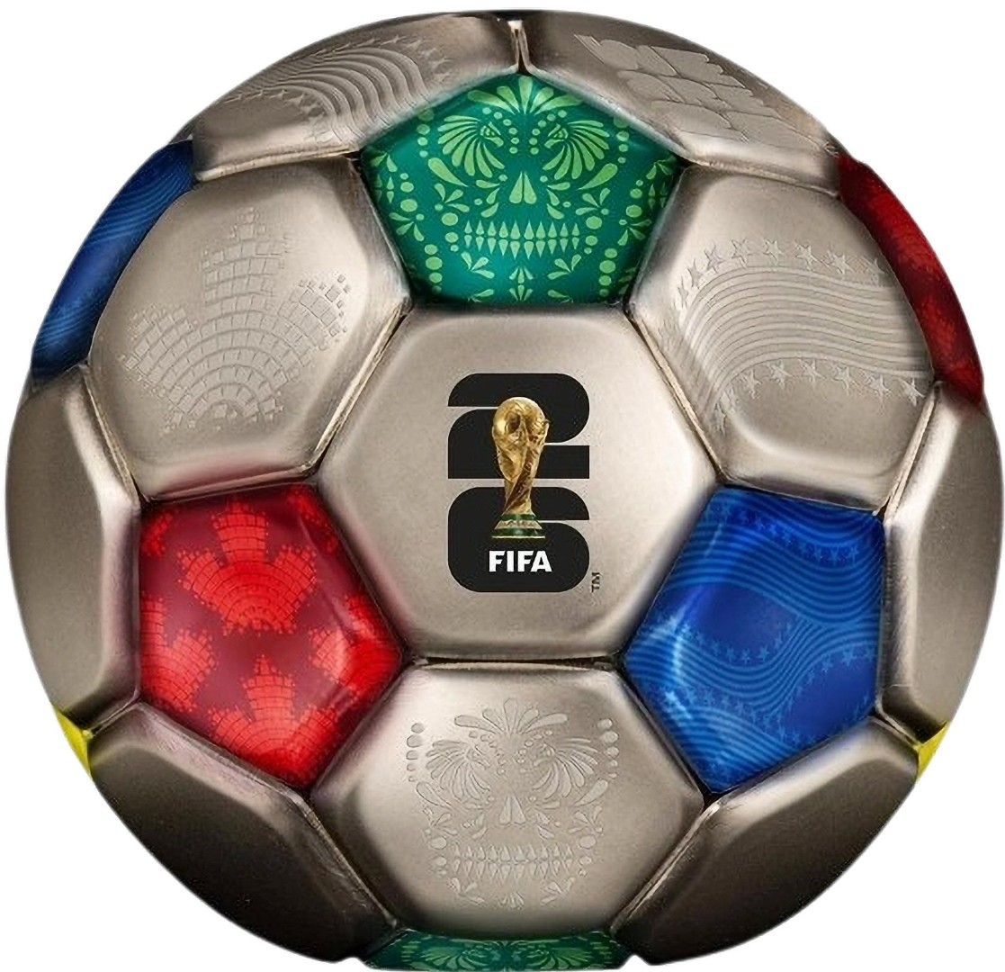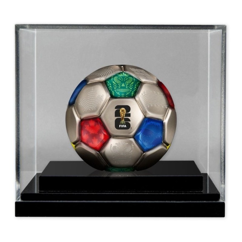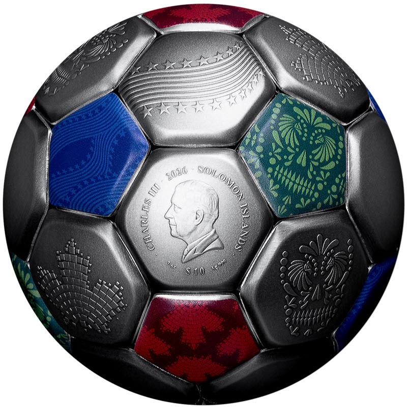 Эта удивительная серебряная монета весом 3 унции посвящена Чемпионату мира по футболу FIFA™ 2026 года. У нее сферическая форма футбольного мяча с античной отделкой. Поставляется в специальном футляре с сертификатом подлинности. Тираж: 2026 штук.