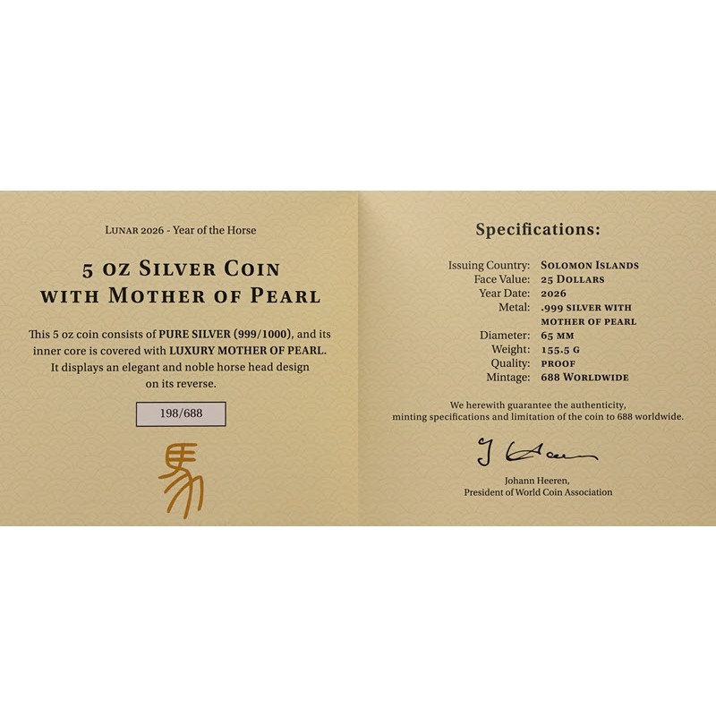 Серебряная монета Соломоновых островов "Год Лошади" (с перламутром) 2026 г.в., 155.5 г чистого серебра (проба 999)