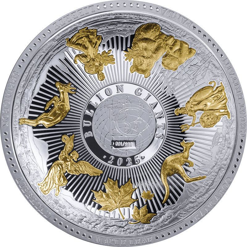 На реверсе в центре изображен земной шар с надписью: BULLION GIANTS ХХХ/999 · 2025 · (инвестиционные гиганты, индивидуальный номер монеты, год чеканки). Вокруг шара представлены образы инвестиционных монет семи стран мира с выборочным золочением в 24К. Против часовой стрелки, с левого верхнего угла изображены: Статуя Свободы (США), Спрингбок (ЮАР), Либертад (Мексика), Кленовый лист (Канада), Кенгуру (Австралия), Британия (Великобритания) и Панда (Китай). Под каждым образом надпись, соответствующая дизайну: LIBERTY SPRINGBOK LIBERTAD M A P L E L E A F K A N G A RO O G R E AT BRITAIN PANDA.