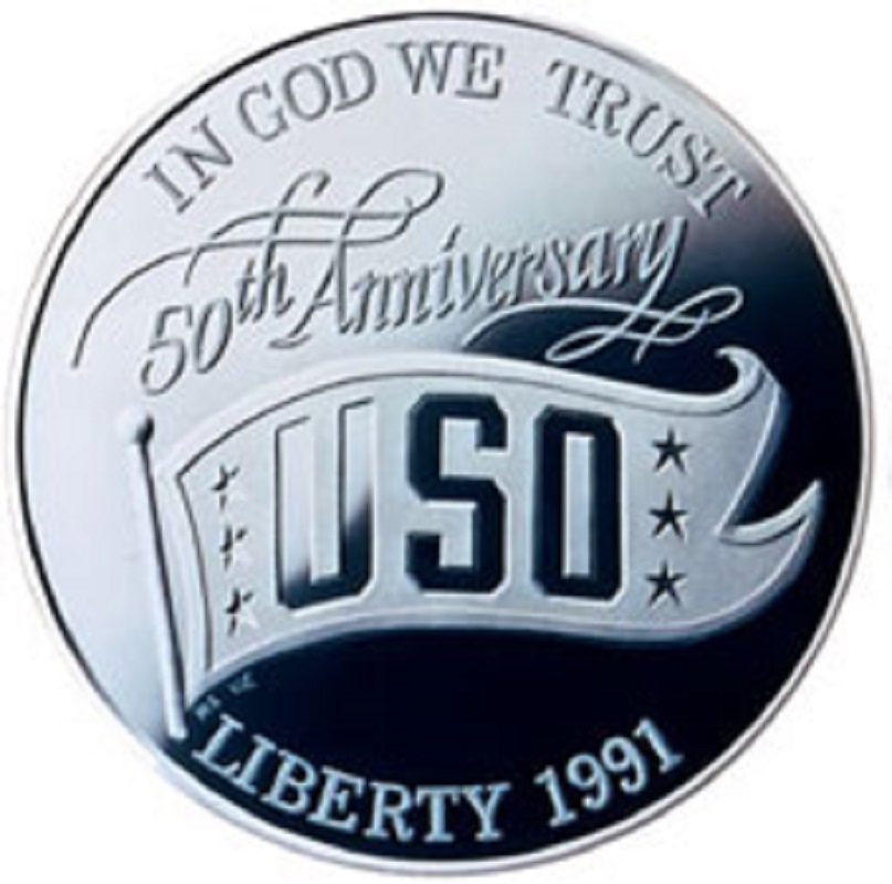 Серебряные доллар США был выпущен в ознаменование 50-летия United Service Organization. USO — это некоммерческая организация, не поддерживаемая государством, которая была основана в 1941 году для обеспечения боевого духа и развлечения военнослужащих США.