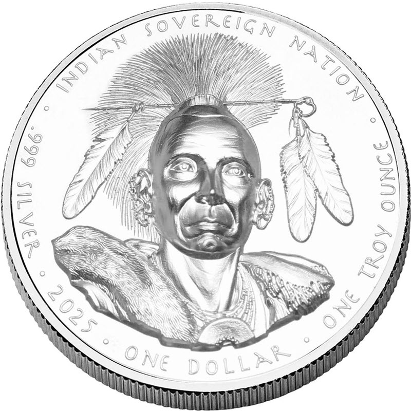 На реверсе изображен вождь Черный Ястреб. Вдоль канта надпись: INDIAN SOVEREIGN NATION · .999 SILVER · 2025 · ONE DOLLAR · ONE TROY OUNCE · (Индейская суверенная нация, вес и проба серебра, год чеканки, номинал).
