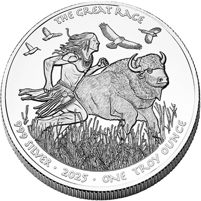 На реверсе изображена гонка между буйволом, человеком и птицами. Вдоль канта надпись: GREAT RACE .999 SILVER · 2025 · ONE TROY OUNCE (Великая гонка, вес и проба серебра, год чеканки).